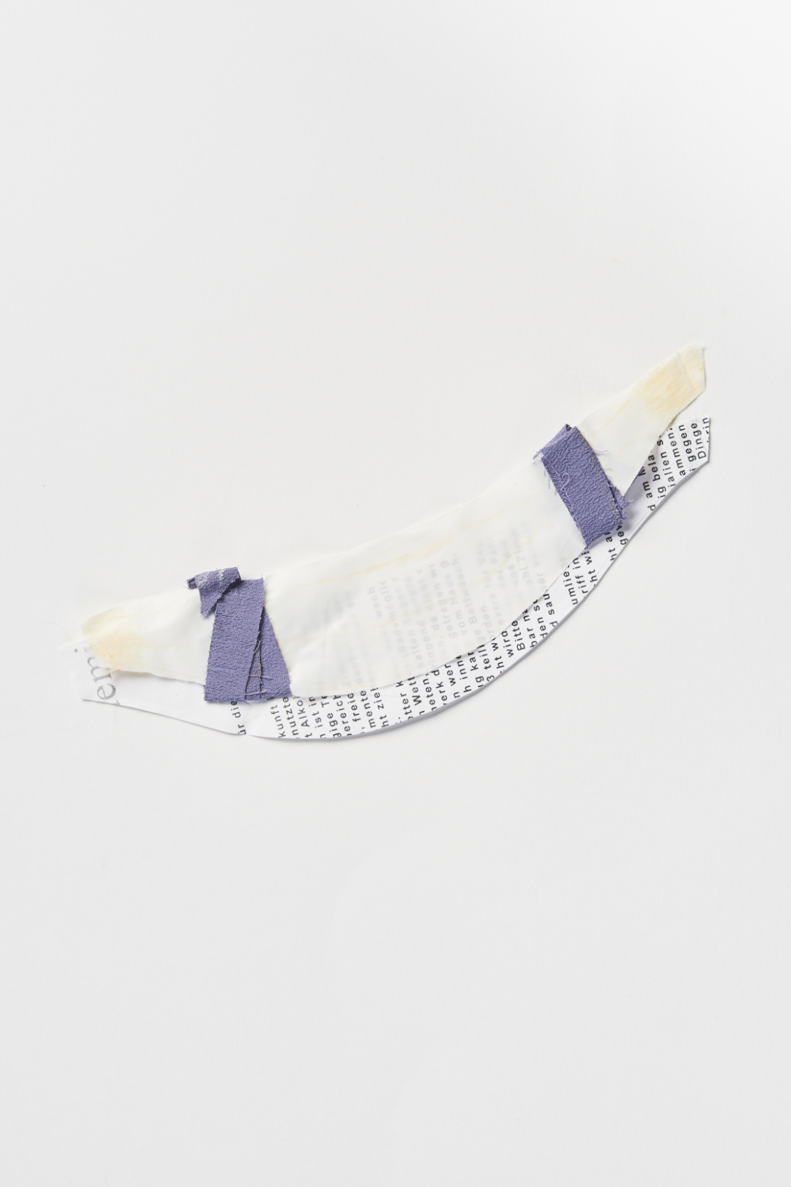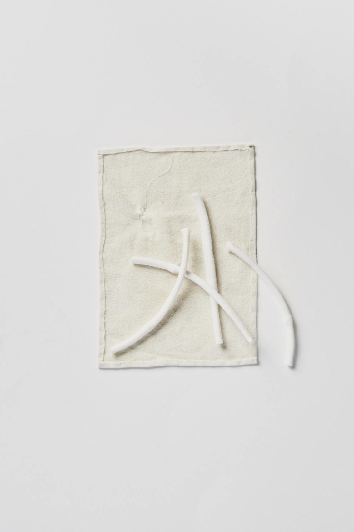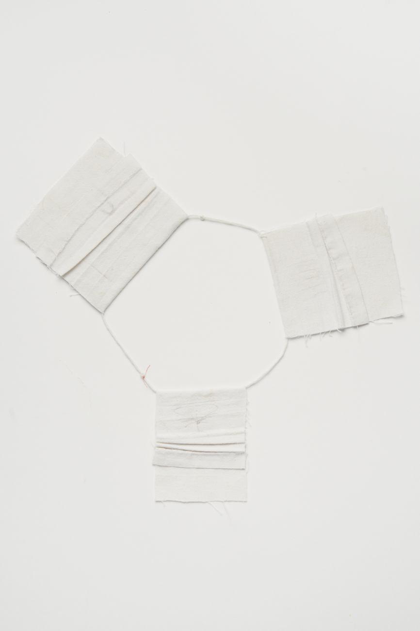 Zwei Modelle der „Bethandschuhe“ sind als Artefakte im Ausstellungsraum positioniert und fungieren so als Bindeglied zwischen der Performance und der Werkreihe der „textilen Stücke“, die auf einem linearen Holzsockel in der Mitte des Raumes sichtbar waren.