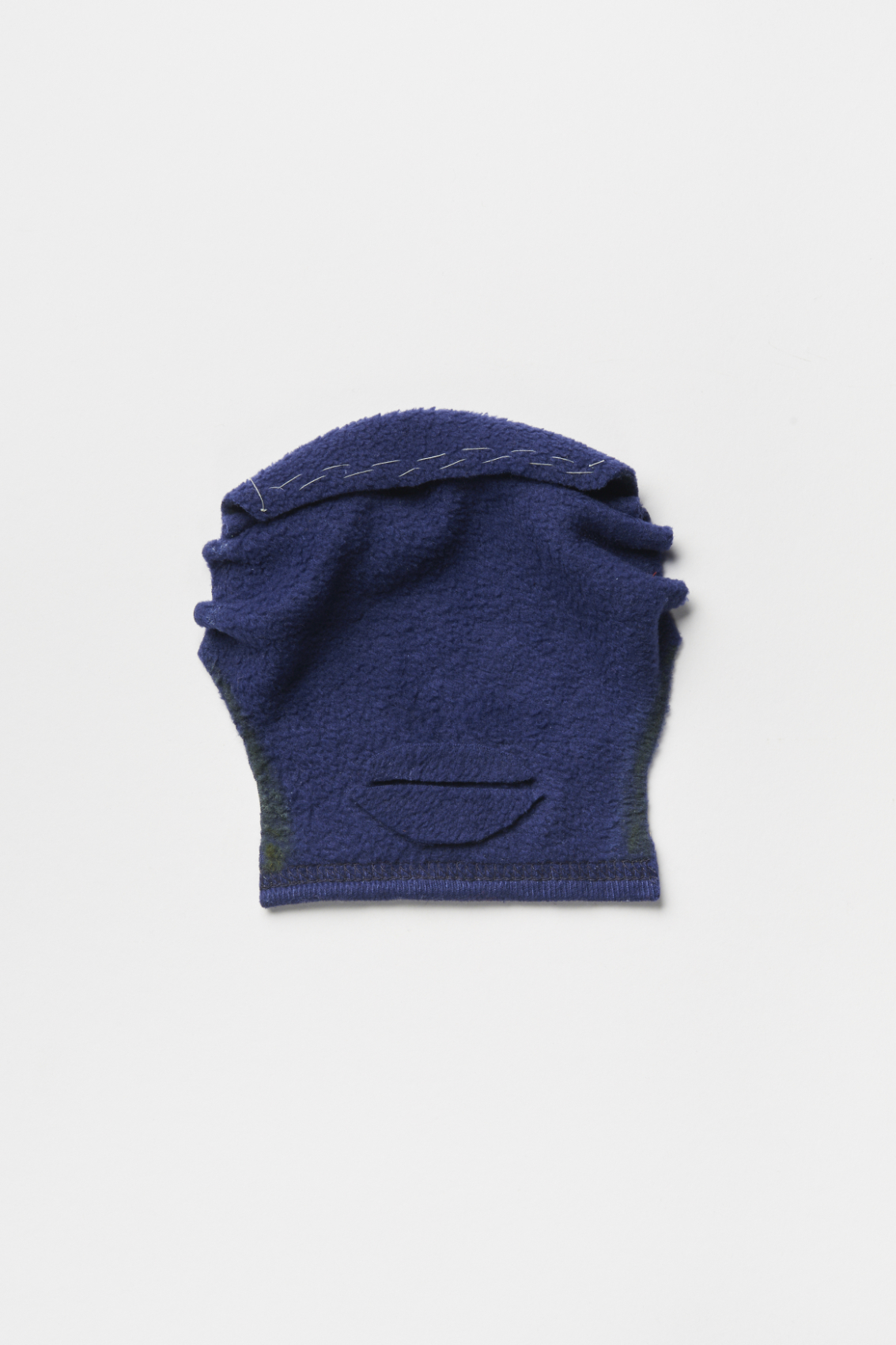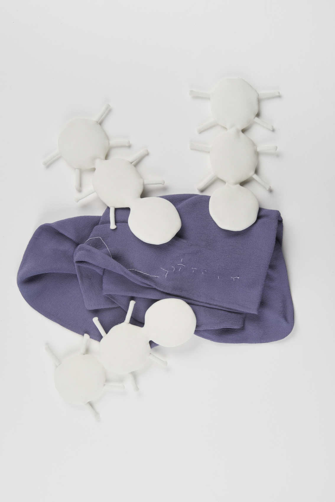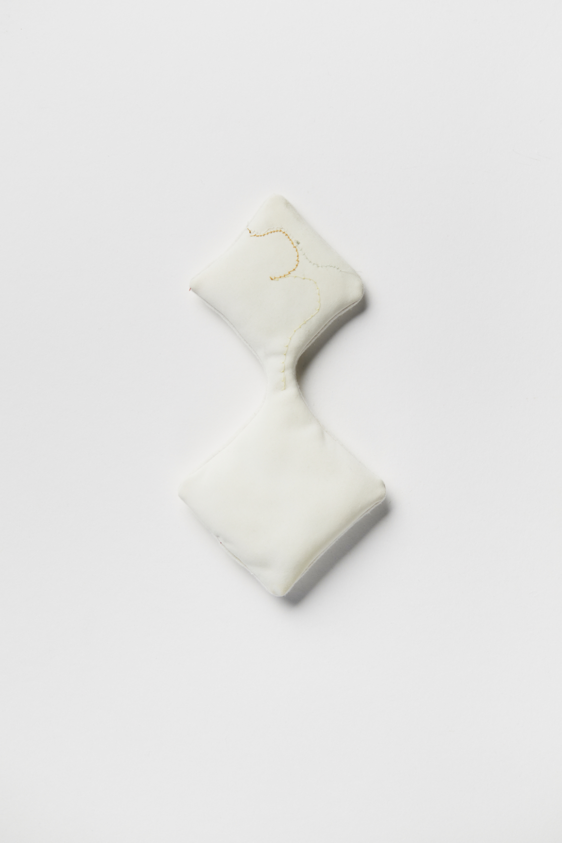 Zwei Modelle der „Bethandschuhe“ sind als Artefakte im Ausstellungsraum positioniert und fungieren so als Bindeglied zwischen der Performance und der Werkreihe der „textilen Stücke“, die auf einem linearen Holzsockel in der Mitte des Raumes sichtbar waren.